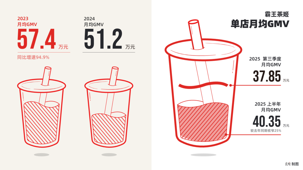 虎嗅获悉,2023年霸王茶姬的单店月均GMV为57.4万元,同比增速为94.9%。到2024年,霸王茶姬的单店月均GMV为51.2万元。2025年上半年,门店单店平均GMV为40.35万元,较前年同期的53.8万元收窄25%。到第三季度,单店月均GMV为37.85万元。